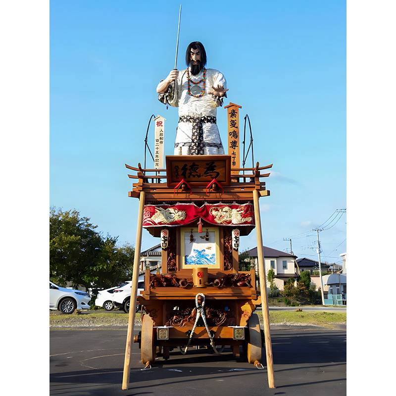 平成元年に旧山車を復元、香取市小見川の田中氏の手によって作られ材料は欅でその重量は約4トン。